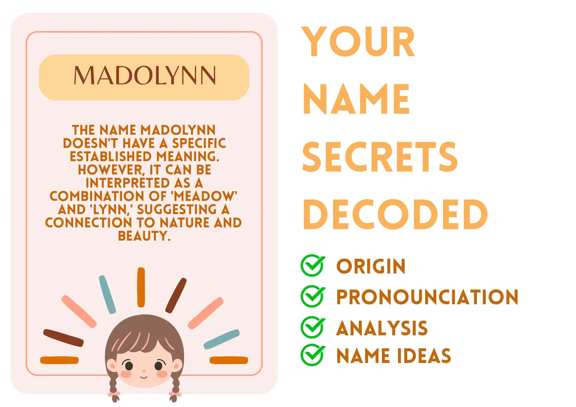 Have you ever walked through a meadow on a warm summer day, soaking in the fresh air and vibrant colors surrounding you? That feeling of tranquility and joy mirrors Madolynn's personality! This name is like a breath of fresh air, distinctive and charming, perfectly capturing the essence of someone who is truly one-of-a-kind. With playful nicknames like Maddie, Lynn, or even Molly, Madolynn brings an aura of familiarity, making her approachable yet undeniably special, just like that rare flower blooming in a sunny field.
