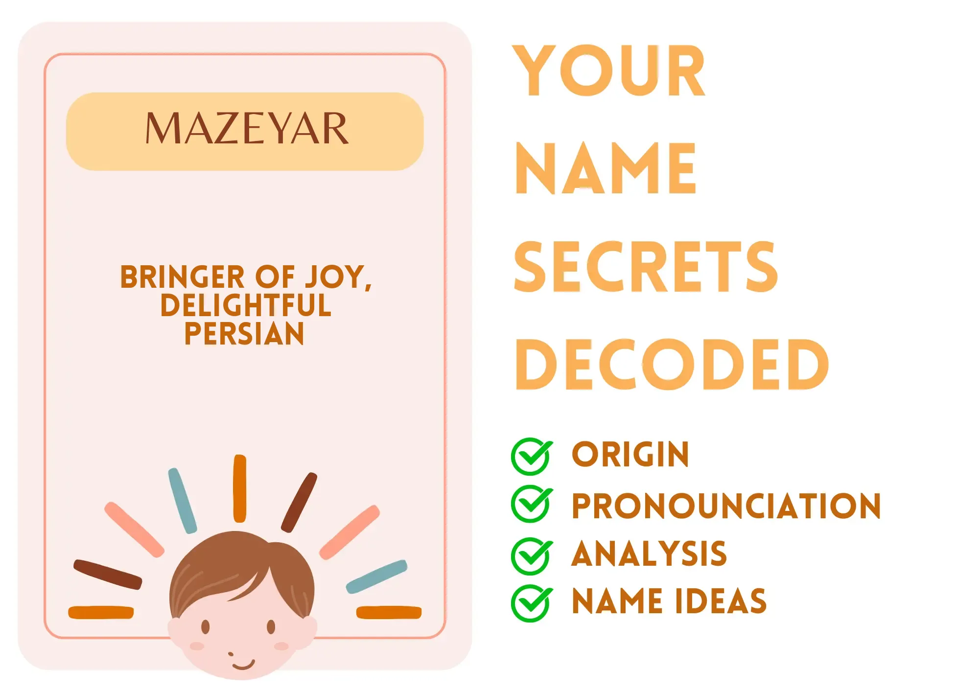 Mazeyar is an intricately woven name of Persian origin, often translated to mean 'the one who brings joy' or 'delightful'. Primarily used in Iranian culture, it carries strong connotations of happiness and warmth. The name is traditionally masculine yet shares a melodic quality that allows for unisex usage.