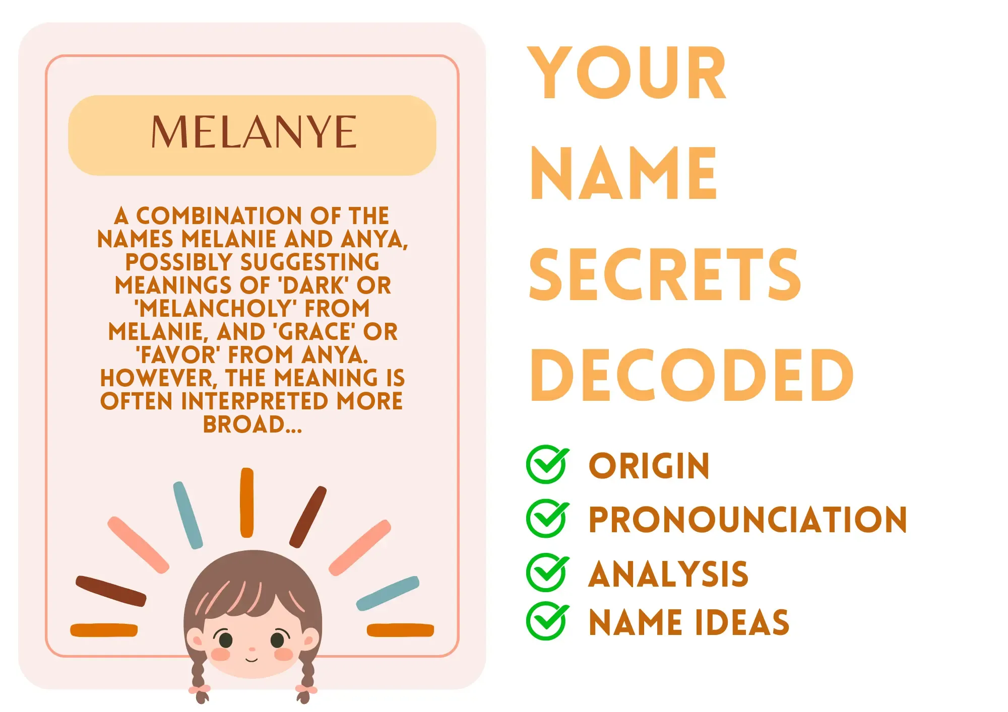 Melanye is a stunning fusion of two names: Melanie, suggesting “dark” or “melancholy,” and Anya, radiating “grace” or “favor.” This combination creates a personality that symbolizes strength and beauty, akin to a wildflower blooming in the middle of a bustling city. These contrasting meanings illuminate the path for Melanye, who may find herself navigating the complexities of emotion with natural flair. Think about it: just like a sunset that can be both breathtaking and solemn, a Melanye possesses a depth of character that draws others in while maintaining an air of mystery.