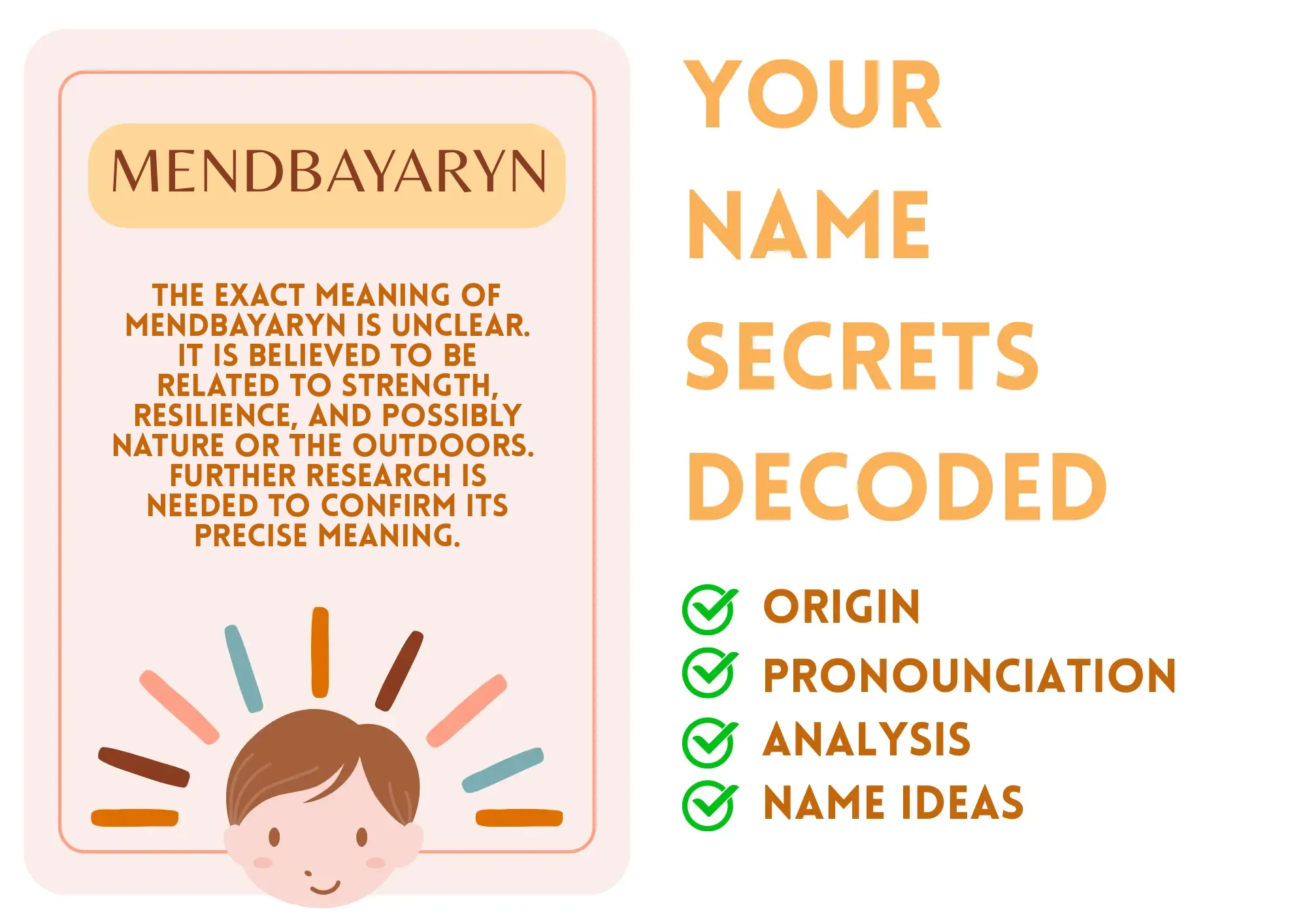 Meaning: The exact meaning of Mendbayaryn is unclear. It is believed to be related to strength, resilience, and possibly nature or the outdoors. Further research is needed to confirm its precise meaning.