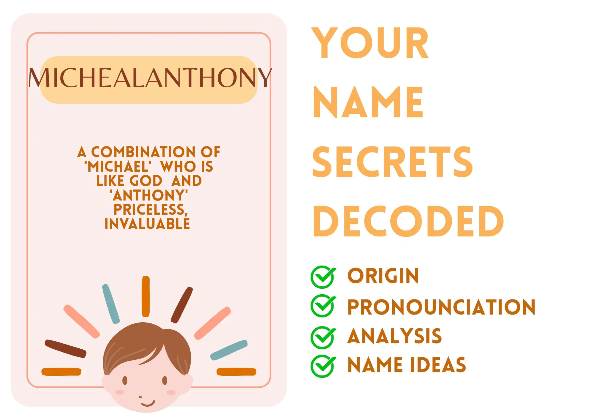 Isn’t it fascinating how a name can shape your personality, like a magician conjuring feelings with a flick of a wand? Meet Michealanthony, a name that combines strength with a touch of elegance. Just picture a hero out of a storybook, filled with adventure and mystery. A name that’s not just a label—but an invitation to greatness! With roots in 'Michael' (who is like God) and 'Anthony' (priceless, invaluable), this name carries the potential for both kindness and strength. And while some might trip over its longer syllables, it still stands tall like a beautiful monument, easy to write but sometimes tricky to say.