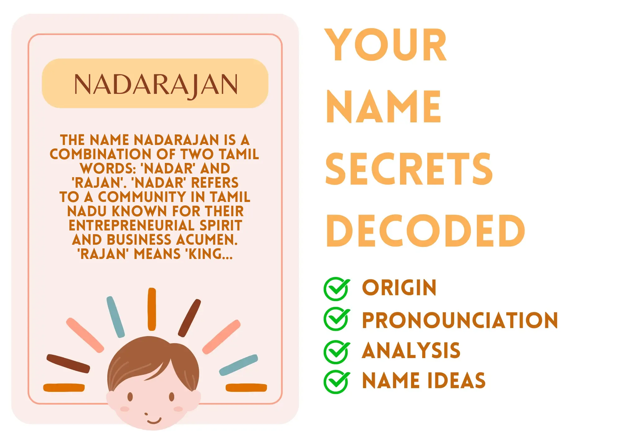 Nadarajan is a Tamil name primarily used in South India, particularly in the state of Tamil Nadu. It carries deep cultural and religious significance, embodying strength, wisdom, and divine protection. The name is traditionally masculine and is often chosen for its auspicious connotations.