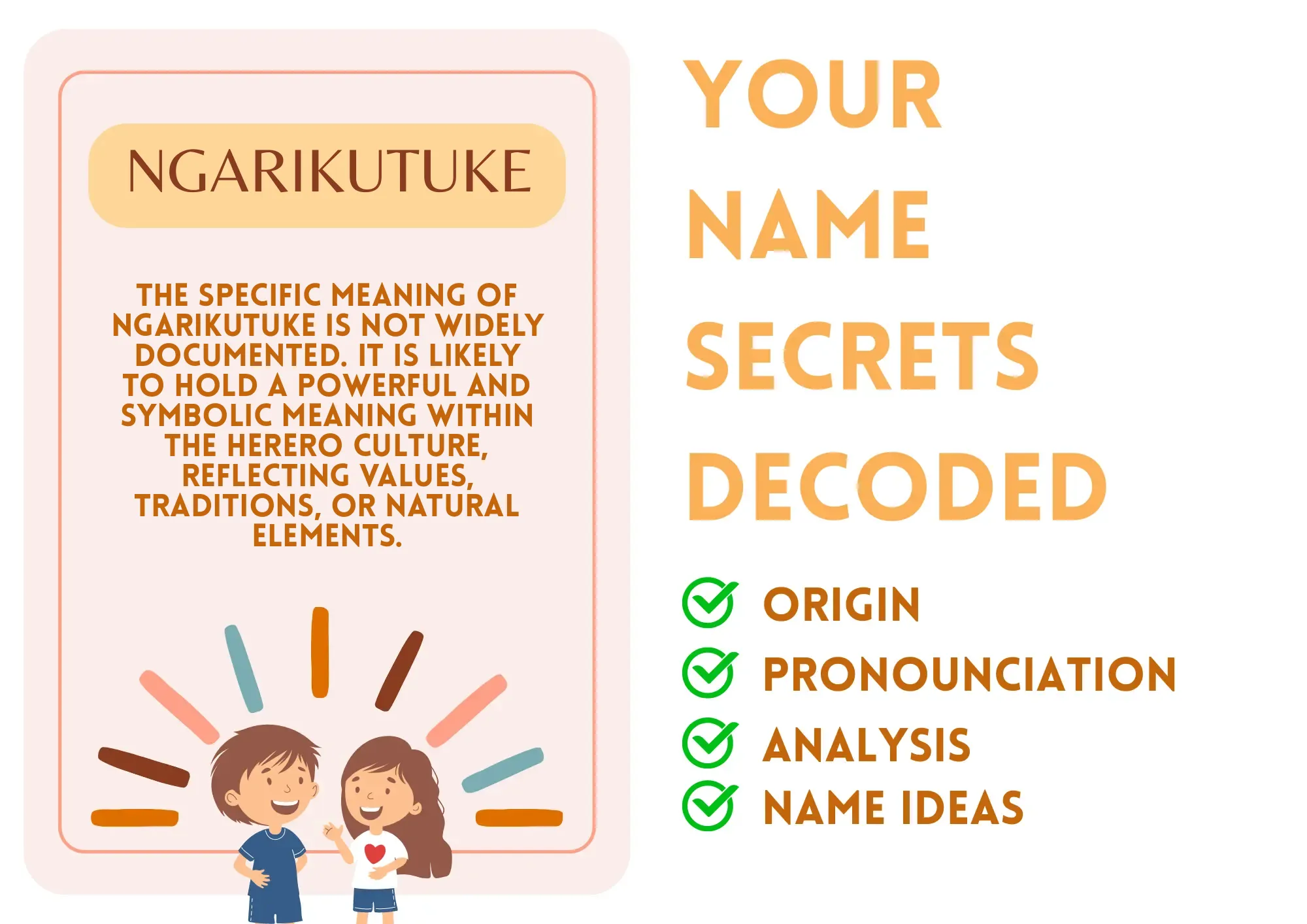 Ngarikutuke is a name that is likely to evoke a sense of pride and connection to the Herero culture. It is a name that is both beautiful and meaningful, making it a unique and memorable choice for parents.
