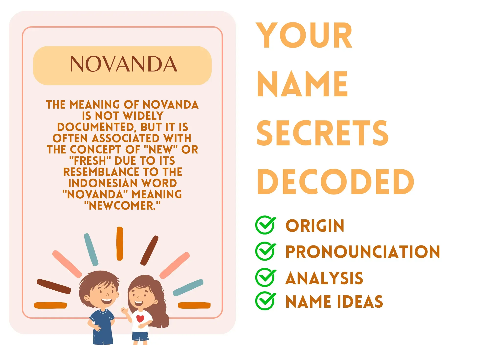 Novanda is a name with a unique sound and a meaning that evokes a sense of new beginnings and innovation. It is a name that is likely to stand out and make a lasting impression. While the meaning and origin of the name are not widely documented, it is often associated with the concept of "new" or "fresh" due to its resemblance to the Indonesian word "novanda" meaning "newcomer."