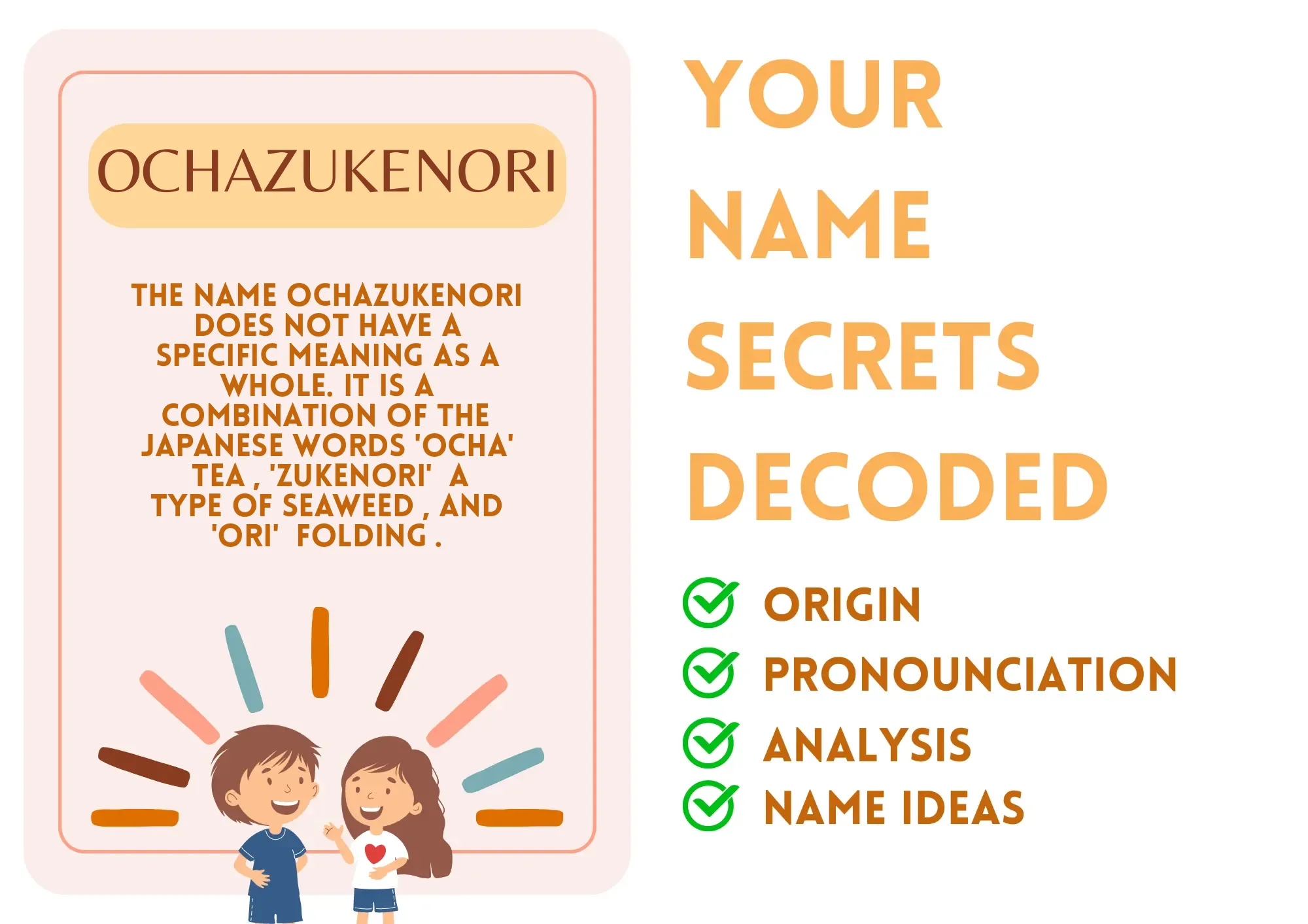 Origin: The name Ochazukenori is of Japanese origin, derived from the combination of three Japanese words: 'ocha,' 'zukenori,' and 'ori.'