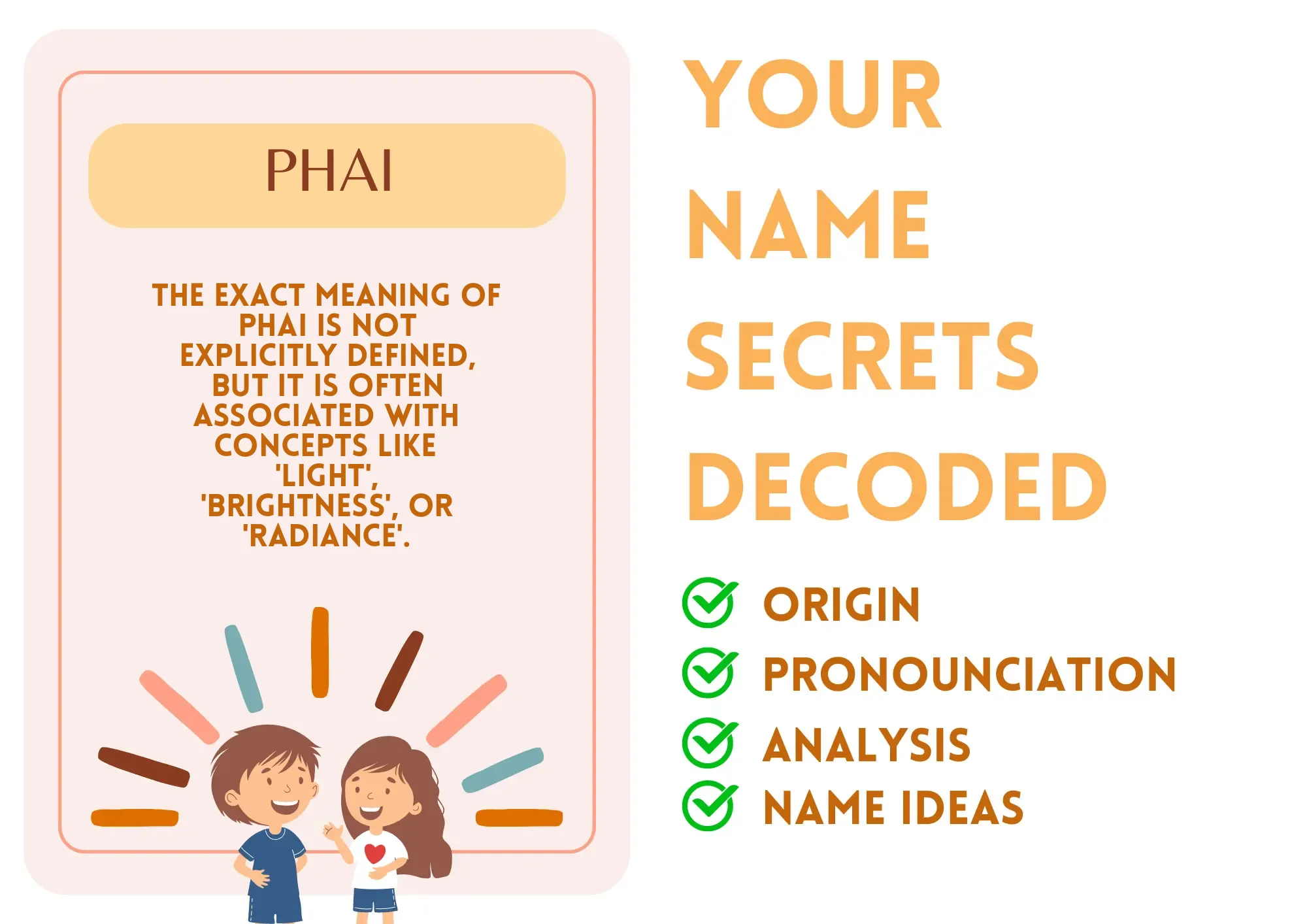 Phai is a gender-neutral name, and its meaning, while not explicitly defined, can be associated with concepts like 'light', 'brightness', or 'radiance'. The name is easy to write and pronounce, making it a memorable and distinctive choice.