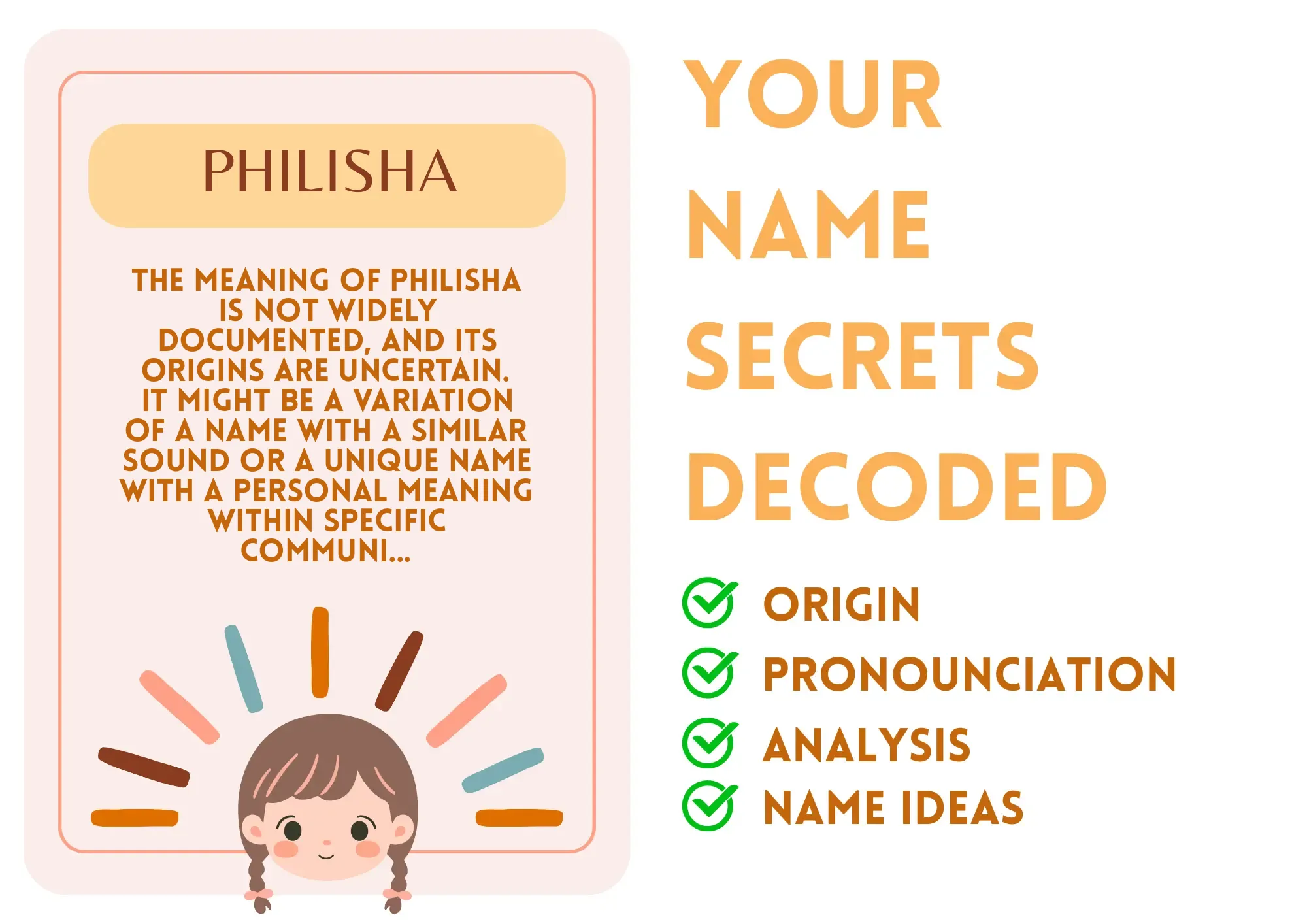 Meaning: The meaning of Philisha is not widely documented, and its origins are uncertain. It might be a variation of a name with a similar sound or a unique name with a personal meaning within specific communities.