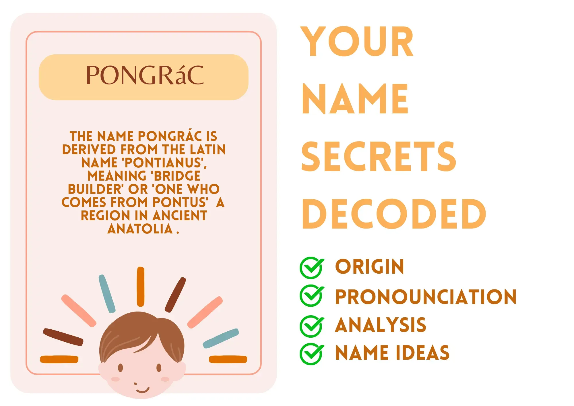 Meaning: The name Pongrác is derived from the Latin name 'Pontianus', meaning 'bridge builder' or 'one who comes from Pontus' (a region in ancient Anatolia).