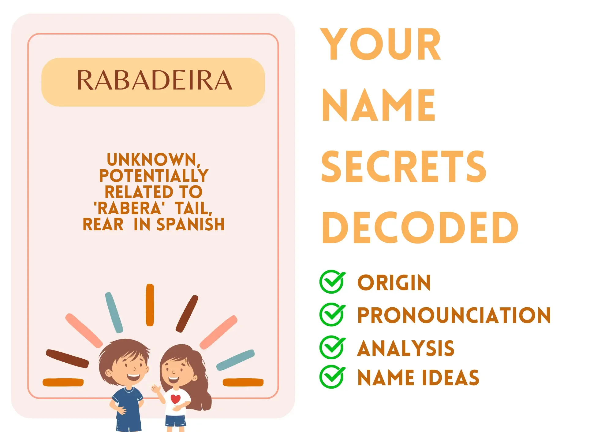 Imagine walking through a vibrant forest, where every tree whispers a different story. That’s what it feels like to be named Rabadeira. This name isn’t just a collection of letters; it’s like wearing a badge of uniqueness that invites curiosity and conversation. Rabadeira's name stands out like a bright flower amongst weeds, beckoning attention and intrigue. If you’re looking to leave a mark on the world, this name gives you a head start!