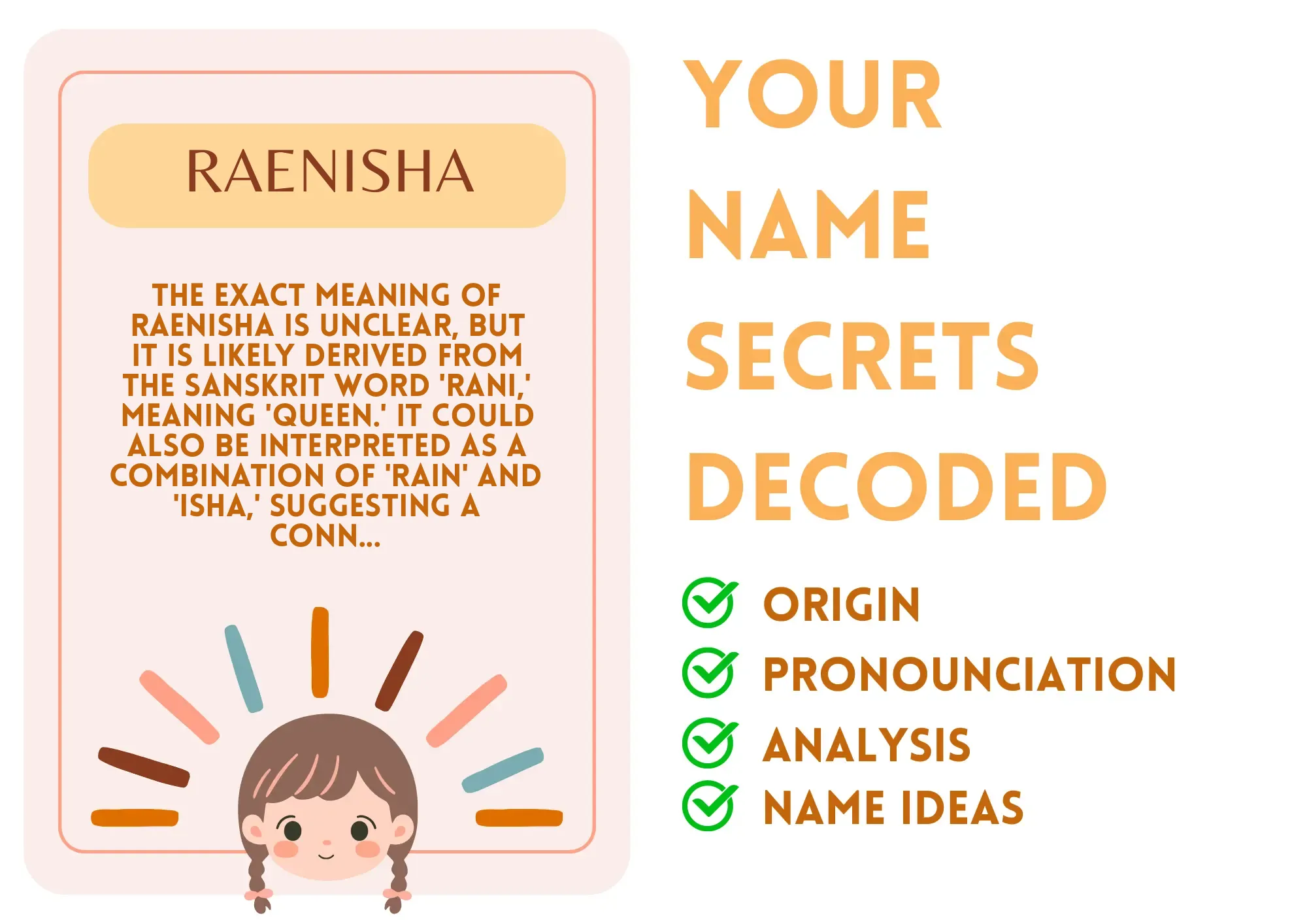 Origin: The origin of Raenisha is uncertain, but it is likely a modern invention. It may have been inspired by the Sanskrit word 'rani,' meaning 'queen.'
