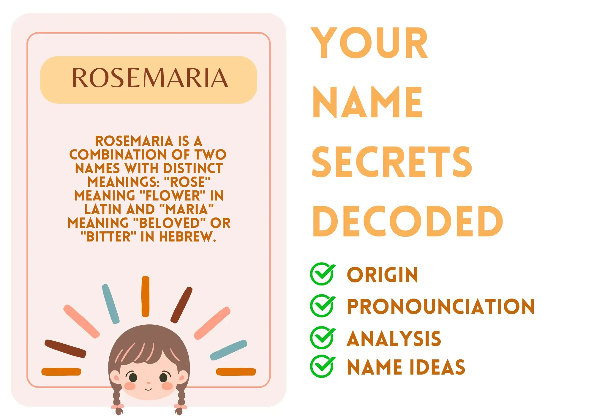Imagine a beautiful garden where every flower has its unique color and fragrance. That's how Rosemaria enchants the world around her! With a name that resonates beauty and strength, she is a blend of grace and resilience. Rosemaria brings a vibrant cheer to everyday life, just like a blooming rose on a sunny day. Not only does her name carry historical richness, but it also embodies qualities like love and devotion that define who she is. Her easy-to-pronounce and distinctive name makes her stand out, giving her a great edge in the journey of life.