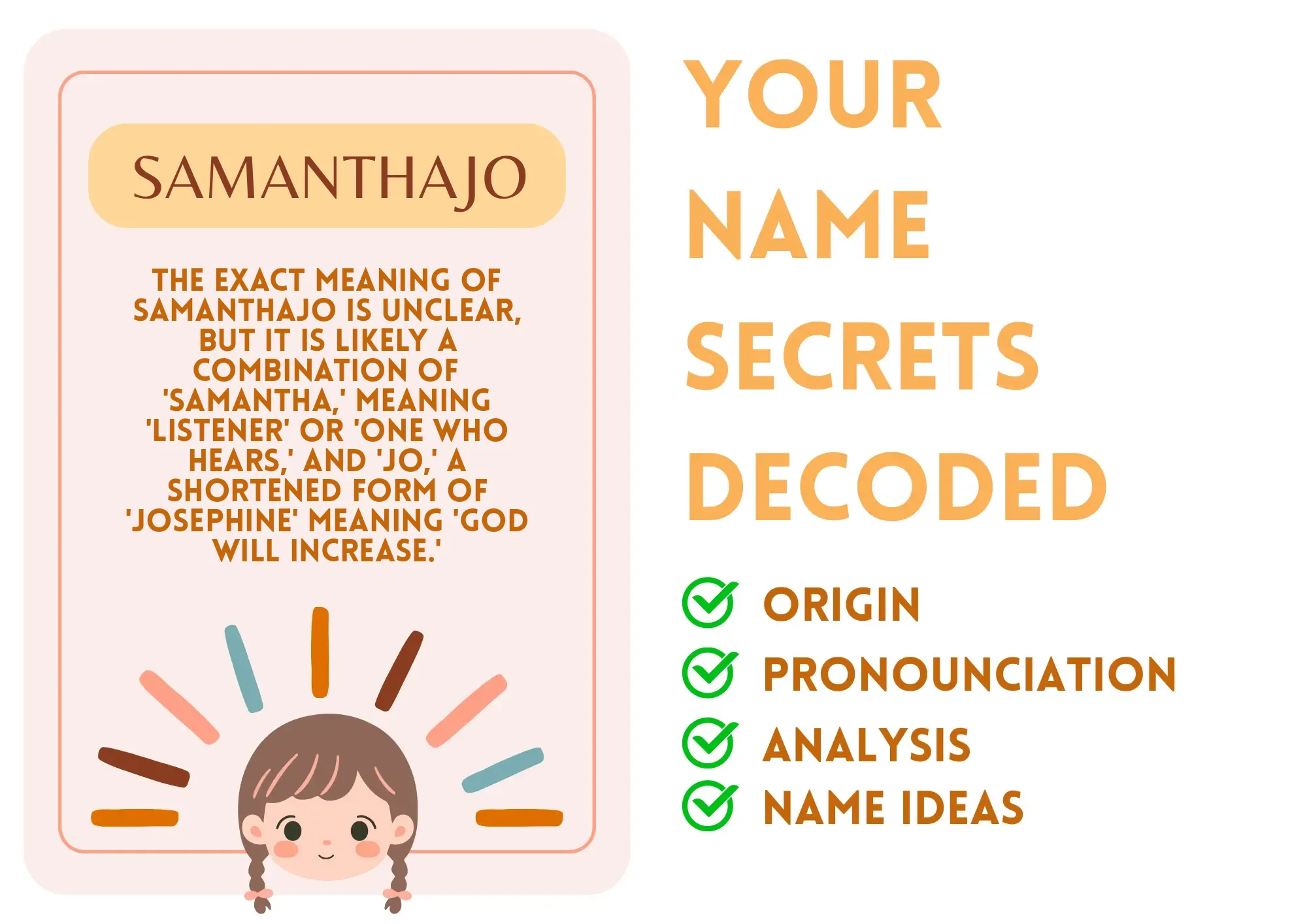 Meaning: The exact meaning of Samanthajo is unclear, but it is likely a combination of 'Samantha,' meaning 'listener' or 'one who hears,' and 'Jo,' a shortened form of 'Josephine' meaning 'God will increase.'