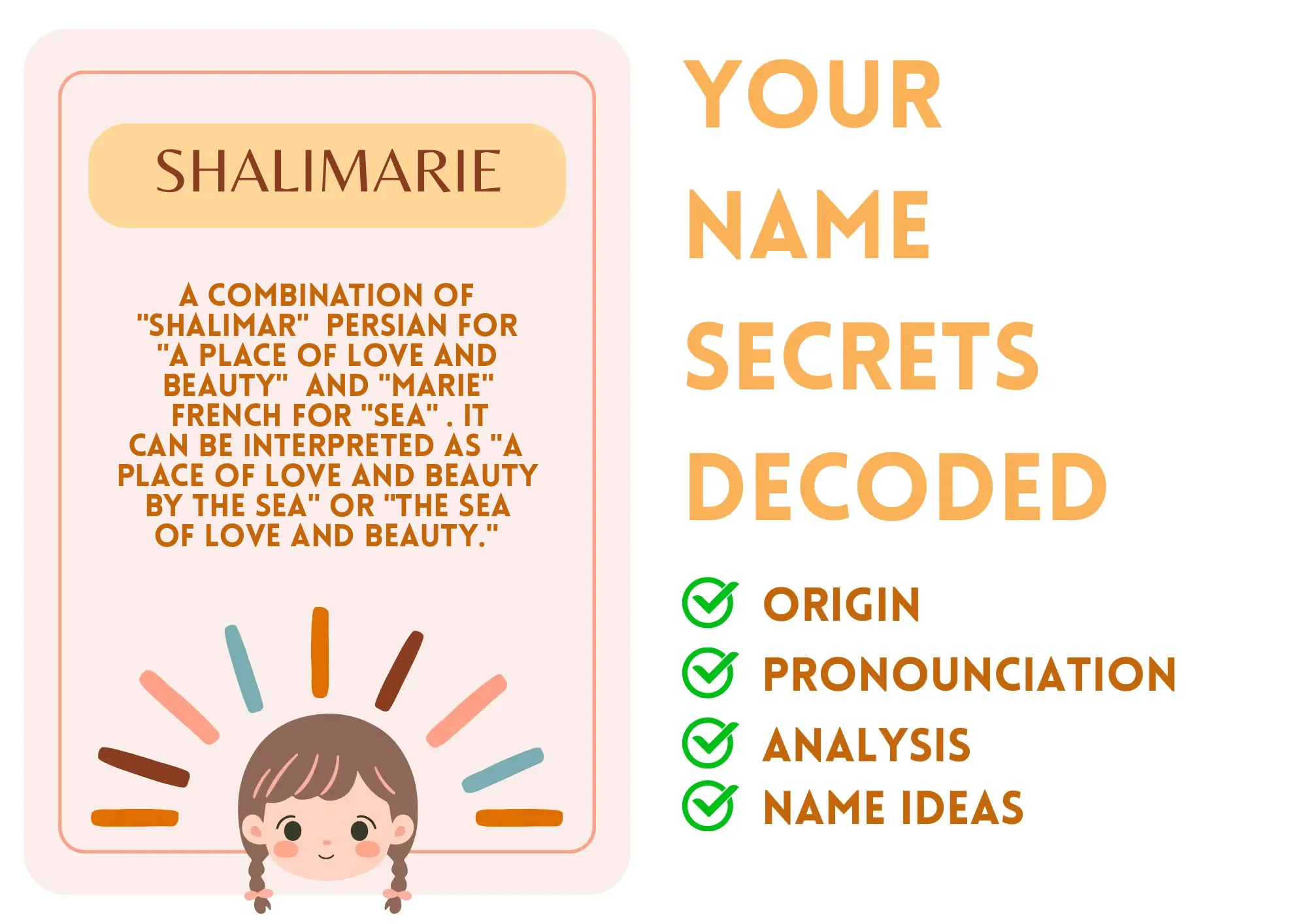 Meaning: A combination of "Shalimar" (Persian for "a place of love and beauty") and "Marie" (French for "sea"). It can be interpreted as "a place of love and beauty by the sea" or "the sea of love and beauty."