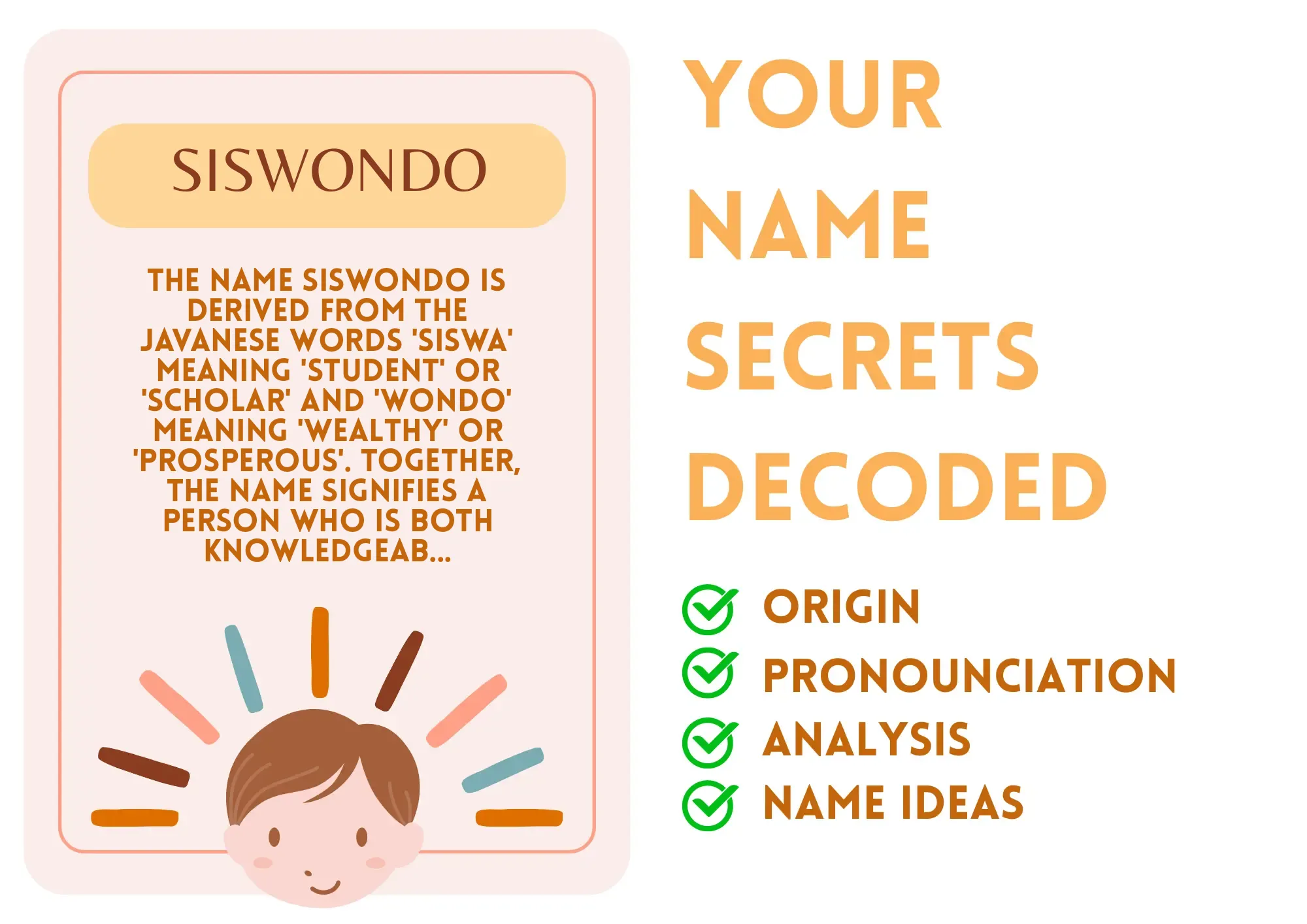 Picture yourself carrying a name that beckons you to be more than just average. With every letter, Siswondo whispers potential, urging you to become a beacon of knowledge and success. It's like wearing a superhero cape, not in a flashy, over-the-top way, but in the serene confidence of a wise warrior ready to conquer life's challenges. Siswondo stands as a proud pillar, bridging tradition and modernity, all while inviting you to embrace your unique journey. This is the essence of Siswondo!