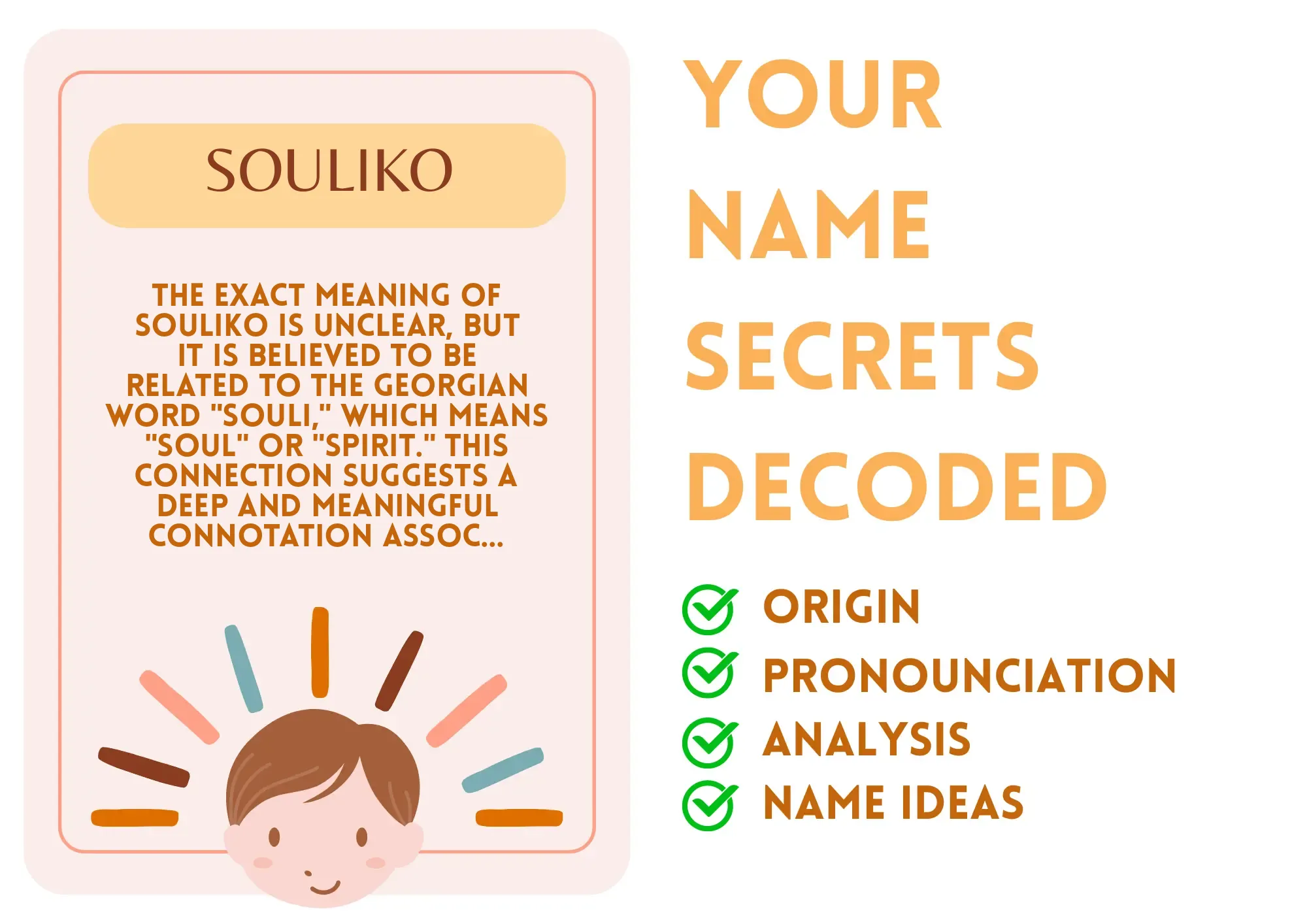 Meaning: The exact meaning of Souliko is unclear, but it is believed to be related to the Georgian word "souli," which means "soul" or "spirit." This connection suggests a deep and meaningful connotation associated with the name.