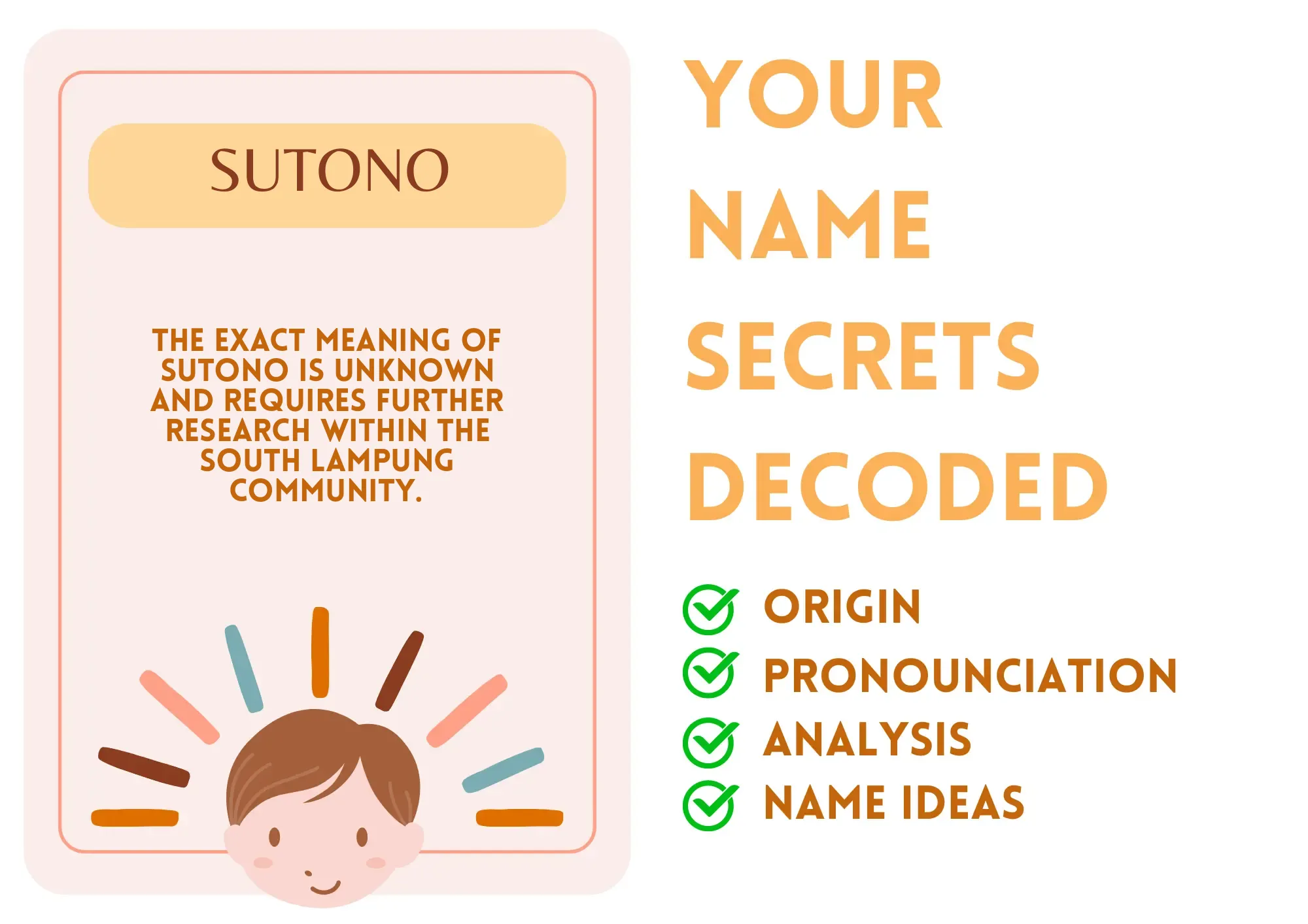 Sutono is a name of Indonesian origin, primarily used in the South Lampung region. While its meaning and cultural significance are not widely documented, it is likely to be a unique and meaningful name within the local community.