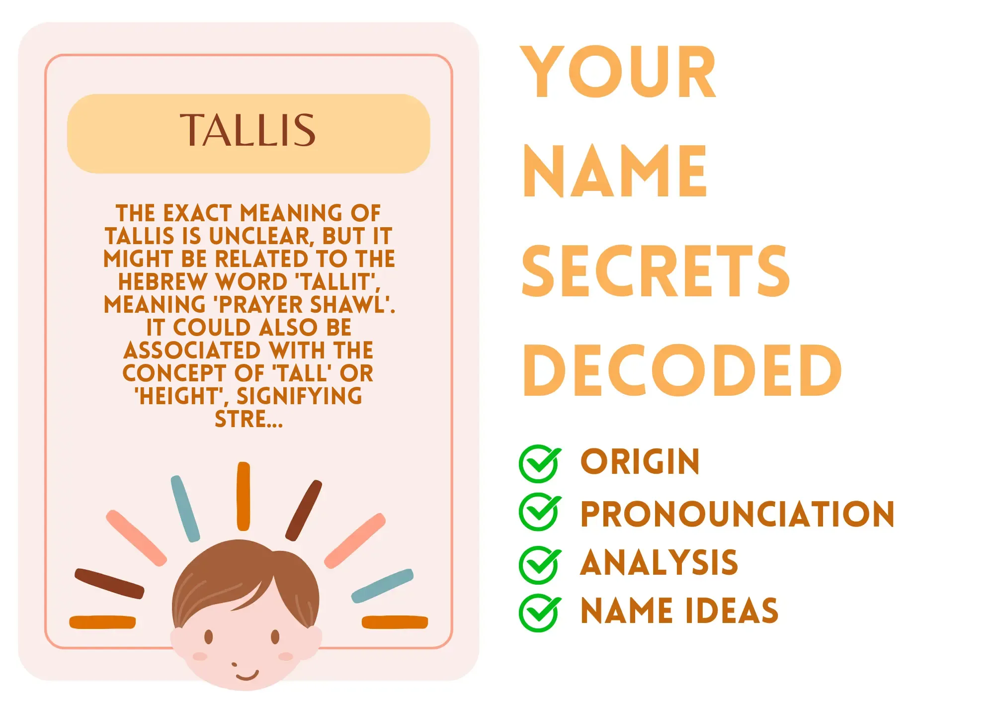 Meaning: The exact meaning of Tallis is unclear, but it might be related to the Hebrew word 'tallit', meaning 'prayer shawl'. It could also be associated with the concept of 'tall' or 'height', signifying strength and resilience.