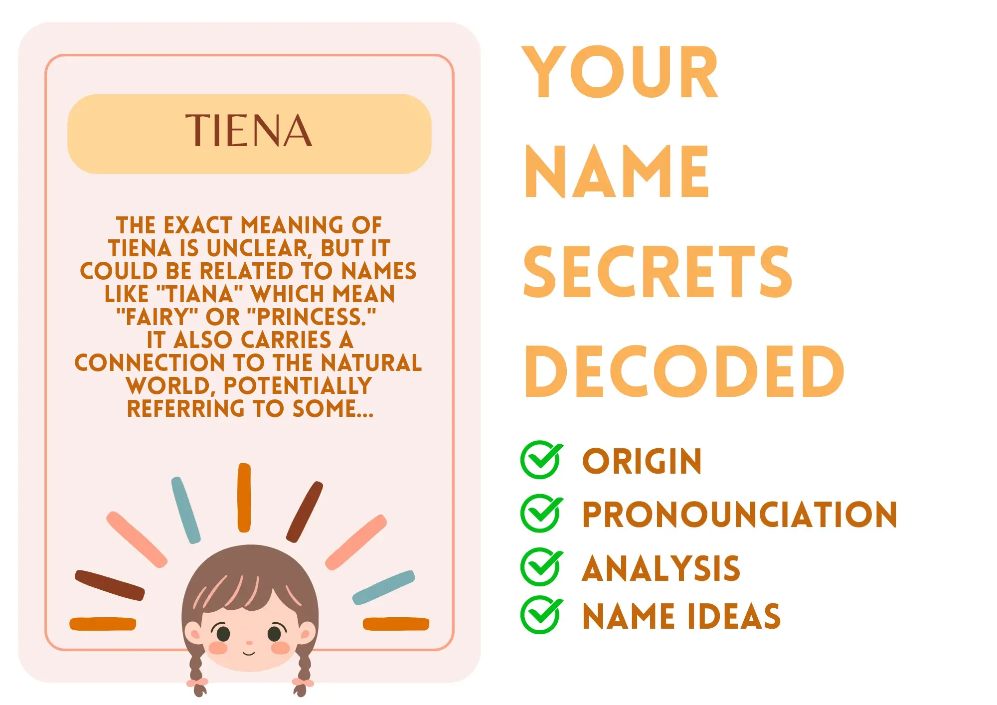 Meaning: The exact meaning of Tiena is unclear, but it could be related to names like "Tiana" which mean "fairy" or "princess." It also carries a connection to the natural world, potentially referring to something beautiful or delicate like a flower.
