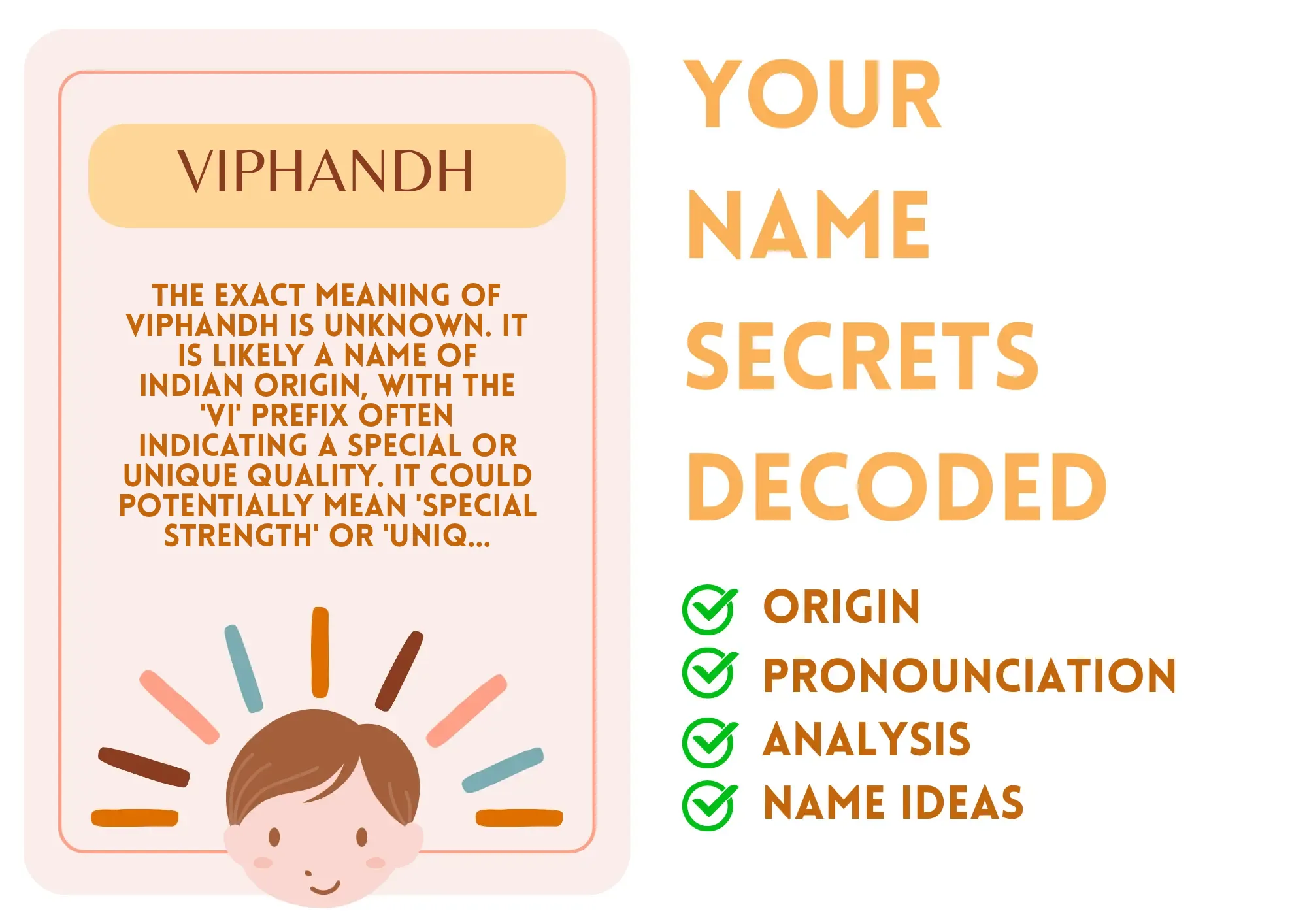 Viphandh is a unique and uncommon name with an intriguing sound. While its origin and meaning are not readily available, the name suggests a strong and powerful presence. It is likely a name of Indian origin, with the 'Vi' prefix often indicating a special or unique quality.