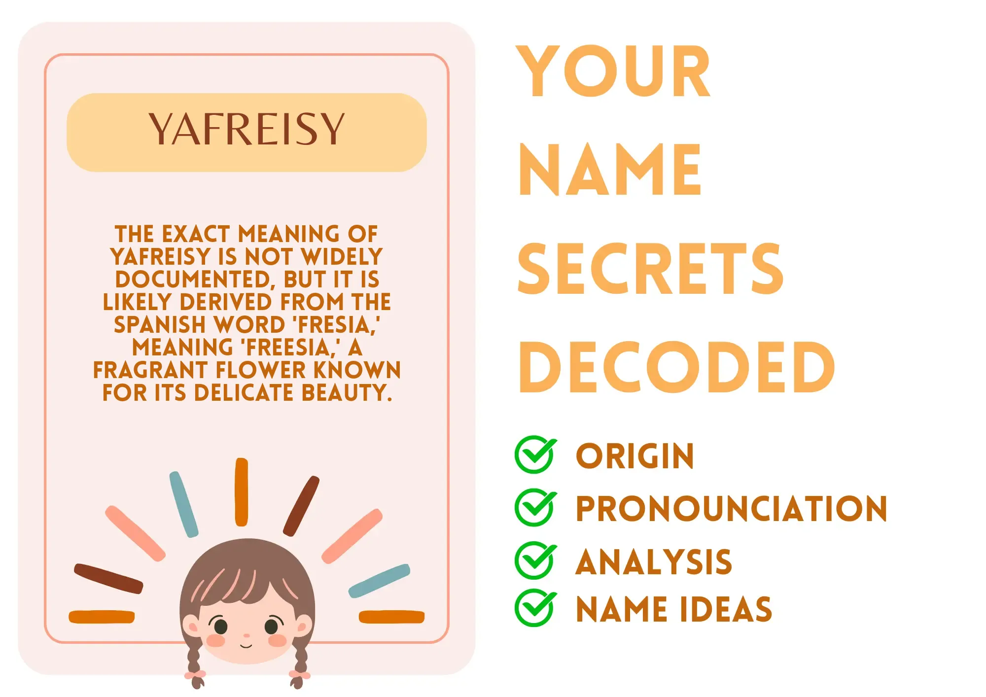 The name Yafreisy evokes feelings of grace, elegance, and natural beauty. It is easy to pronounce and write, though its uncommon nature might require some spelling clarification.