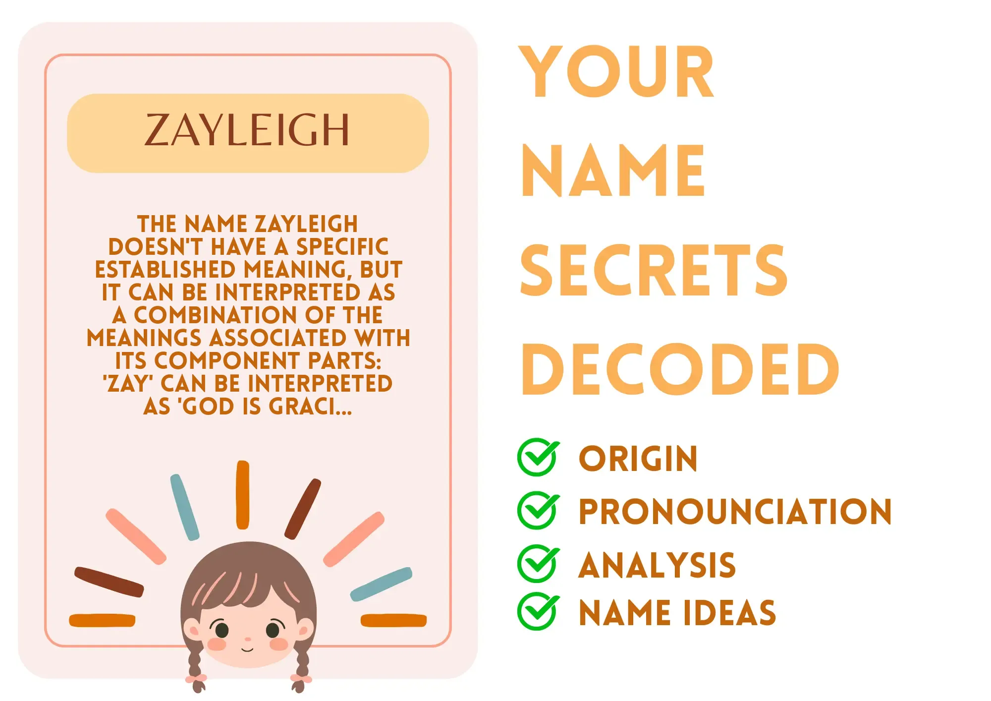 Zayleigh is a name that hints at someone who embodies kindness and blessing. The “Zay” in her name whispers of grace, while “Leigh” invites thoughts of peaceful meadows. Imagine Zayleigh as someone who effortlessly brings calm and joy into a room—she’s the friend who always has your back, providing that reassuring presence, just like a cozy blanket on a chilly day. This nature of nurturing can be a superpower in her relationships, drawing others toward her like bees to sunny flowers.