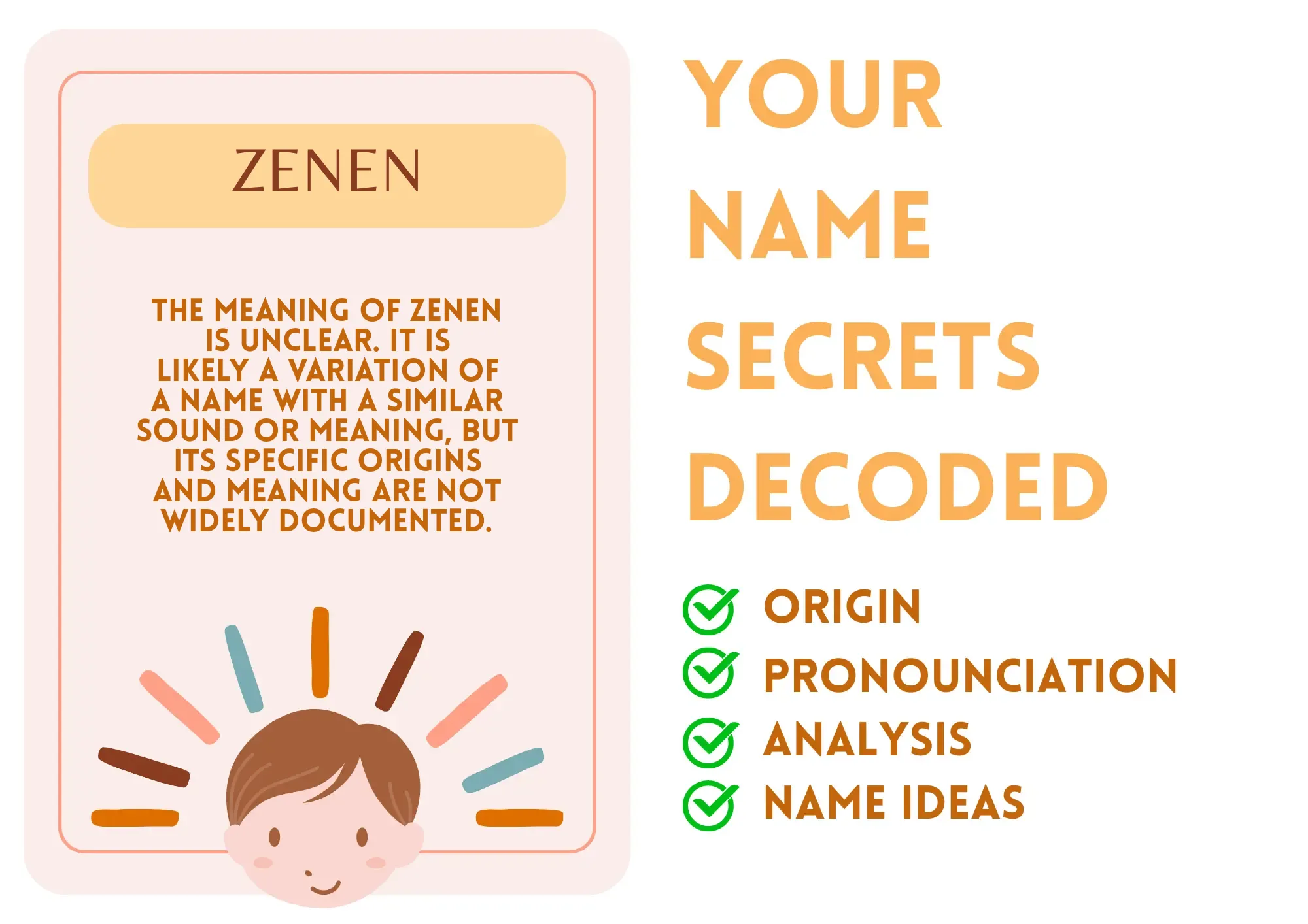 Meaning: The meaning of Zenen is unclear. It is likely a variation of a name with a similar sound or meaning, but its specific origins and meaning are not widely documented.