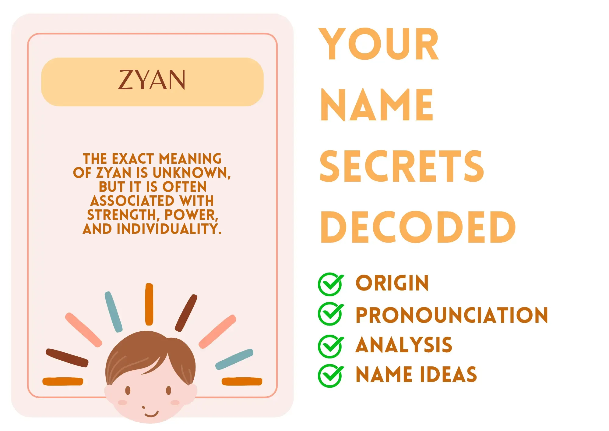 Zyan is a modern and unique name with a strong and distinctive sound. It is of unknown origin but is often associated with strength, power, and a sense of individuality. Though it is primarily used for boys, Zyan can also be considered unisex. The name is gaining popularity, especially among parents seeking a name that is both modern and memorable.