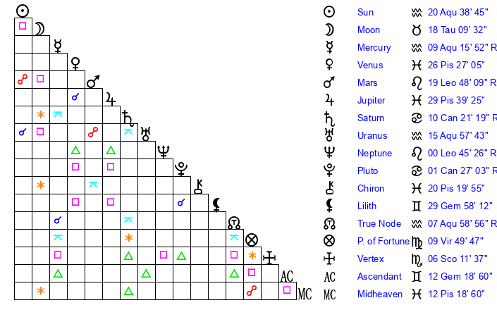 | Sun | 20 Aquarius 38 | 22 Aquarius 12 | 7 Gemini 57 |