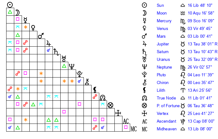 | Sun | 16 Libra 48 | 17 Libra 12 | 12 Capricorn 30 |