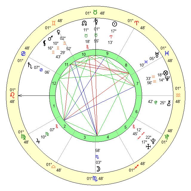 | Moon | 3 Scorpio 56 | 6 Leo 44 | 7 Leo 19 |