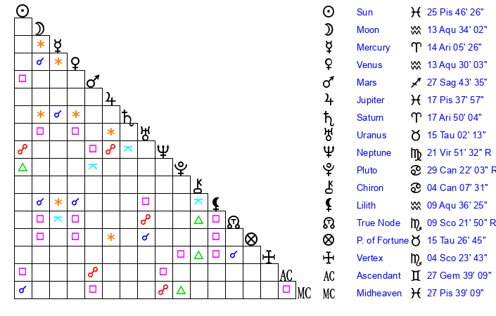 | Sun | 25 Pisces 46 | 26 Pisces 55 | 19 Gemini 26 |