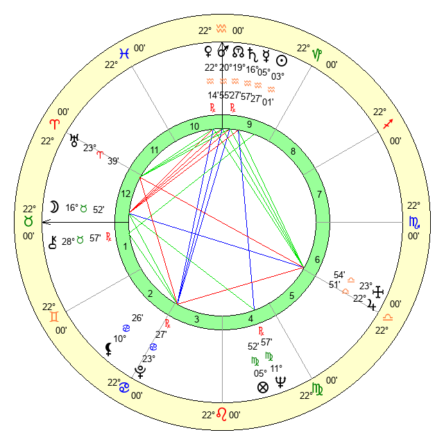 | Moon | 16 Taurus 55 | 24 Scorpio 1 | 4 Virgo 49 |