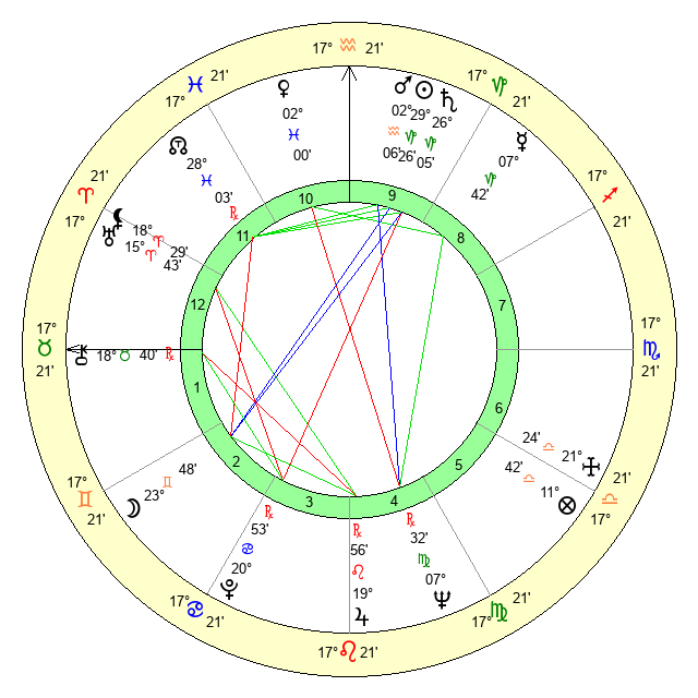 | Moon | 23 Gemini 45 | 18 Libra 25 | 28 Scorpio 9 |