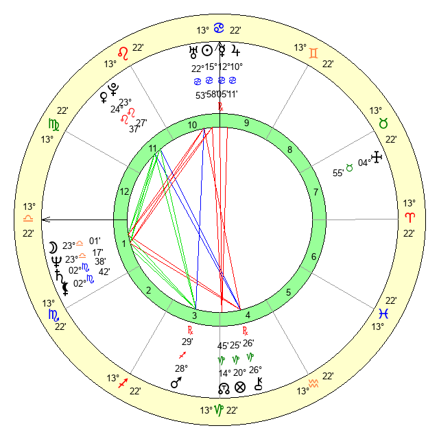| Moon | 23 Libra 6 | 21 Sagittarius 46 | 1 Gemini 3 |