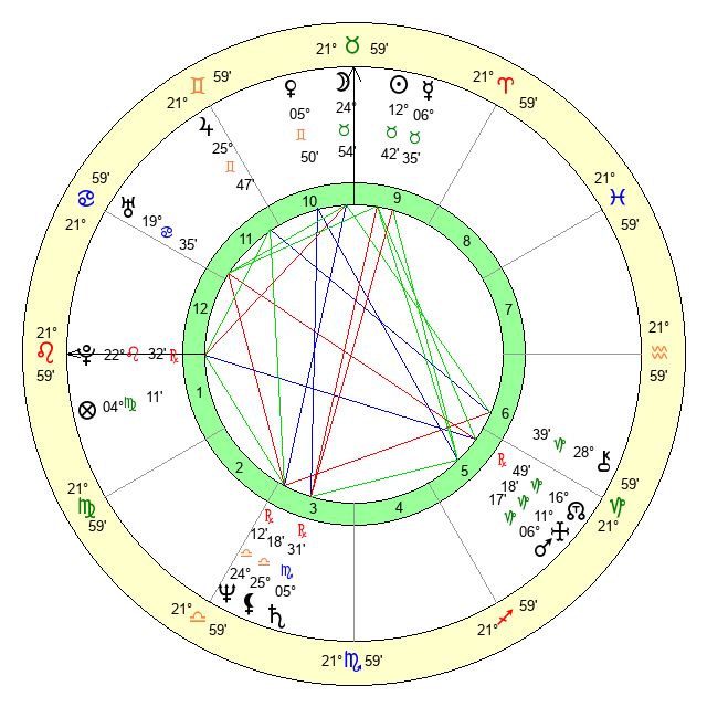 | Moon | 24 Taurus 54 | 3 Leo 9 | 23 Sagittarius 26 |
