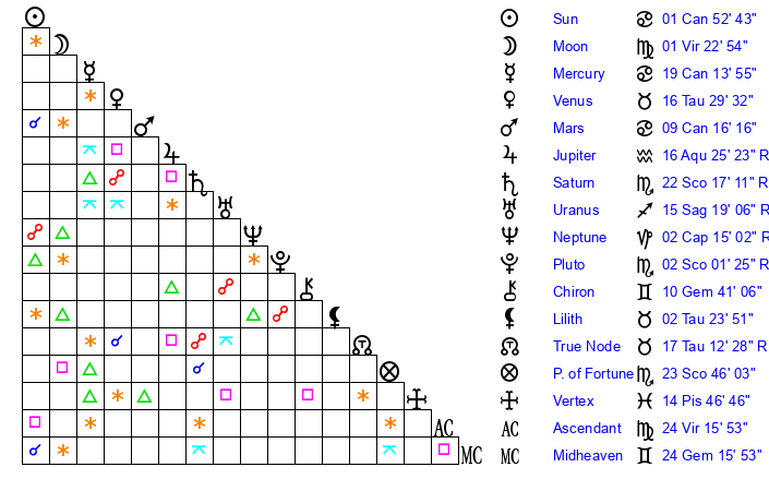 | Moon | 1 Virgo 26 | 4 Gemini 21 | 28 Aquarius 34 |