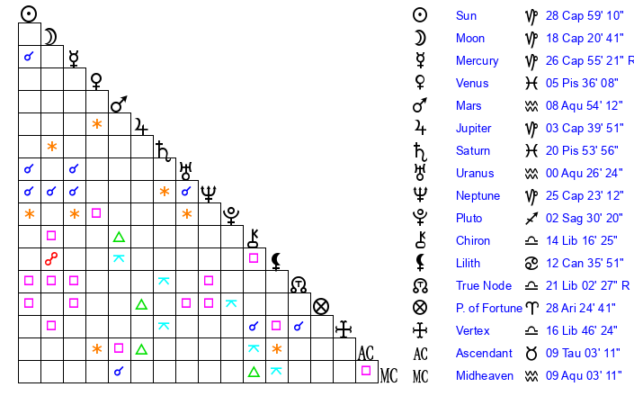 | Mercury | 26 Capricorn 54 | 16 Capricorn 51 | 3 Aquarius 9 |