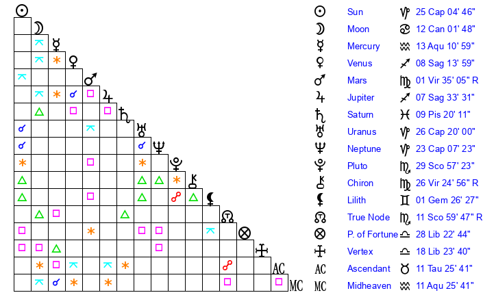 | Neptune | 23 Capricorn 7 | 27 Pisces 33 | 24 Capricorn 13 |