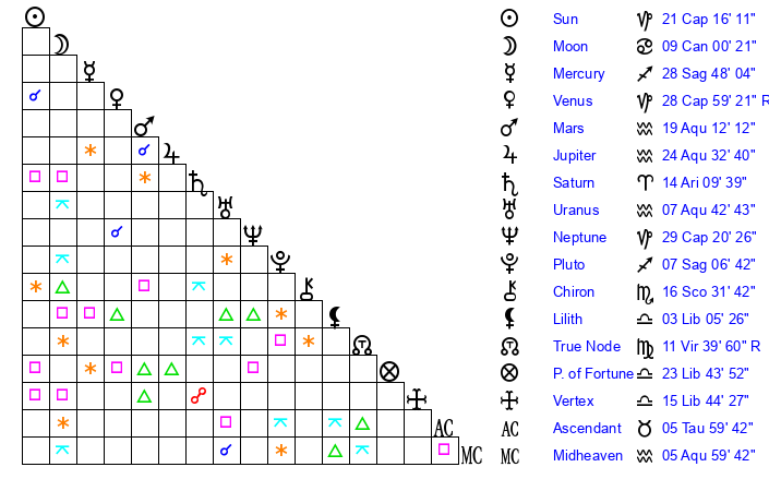 | Venus | 29 Capricorn 0 | 8 Pisces 53 | 18 Capricorn 32 |