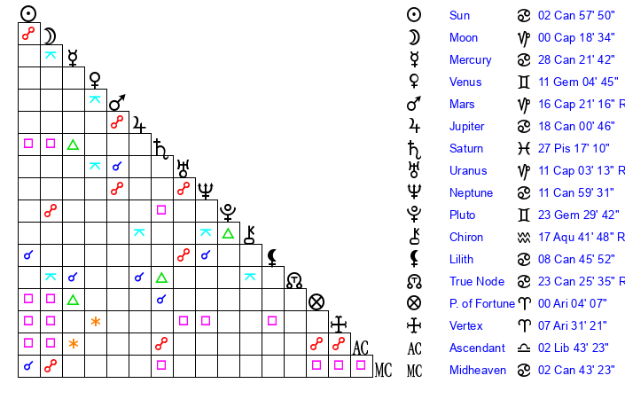 | Mercury | 28 Cancer 22 | 28 Cancer 33 | 21 Scorpio 15 |