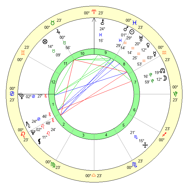| Sun | 29 Aquarius 14 | 0 Pisces 2 | 15 Gemini 8 |