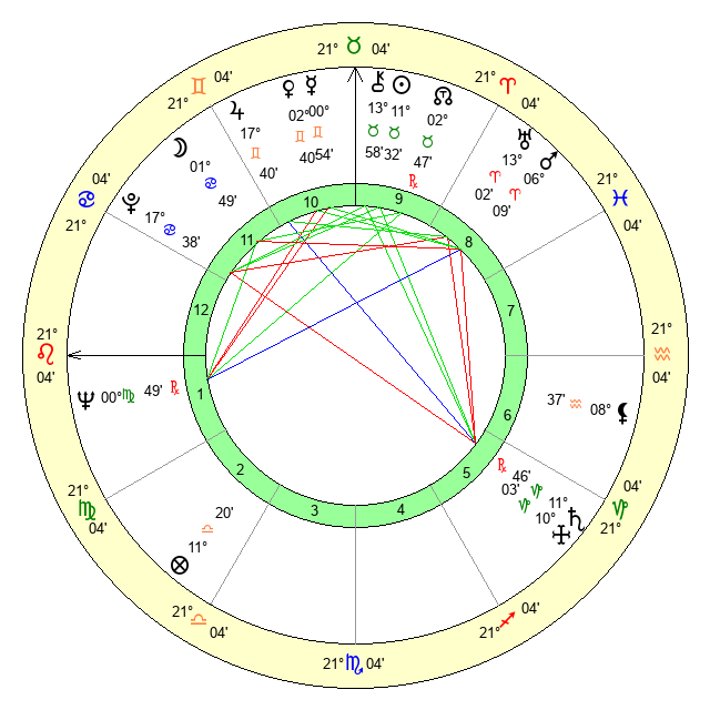 | Mars | 6 Aries 9 | 6 Leo 23 | 15 Gemini 12 |