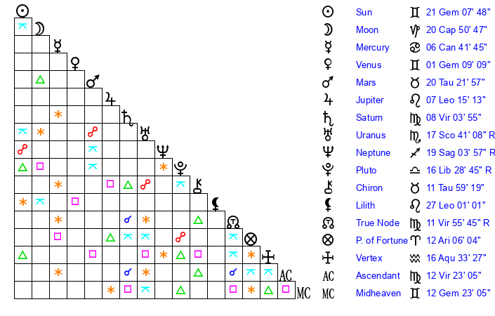 | Saturn | 8 Virgo 27 | 1 Aries 3 | 12 Virgo 21 |
