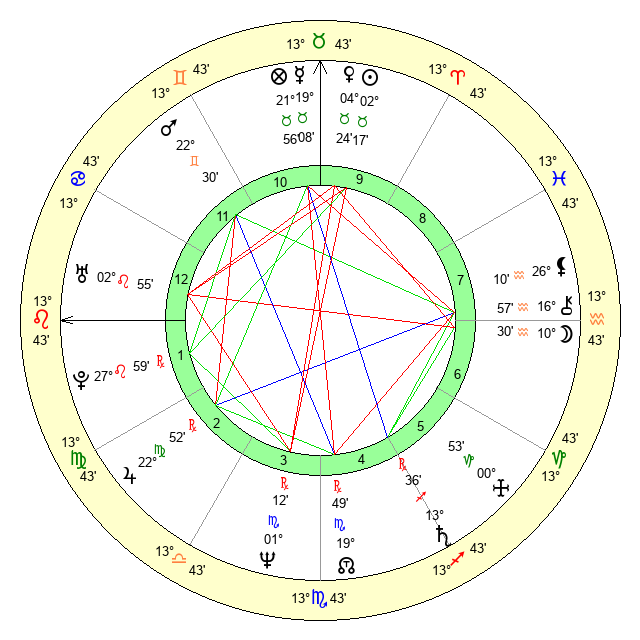 | Pluto | 27 Leo 58 | 3 Aquarius 46 | 28 Leo 31 |
