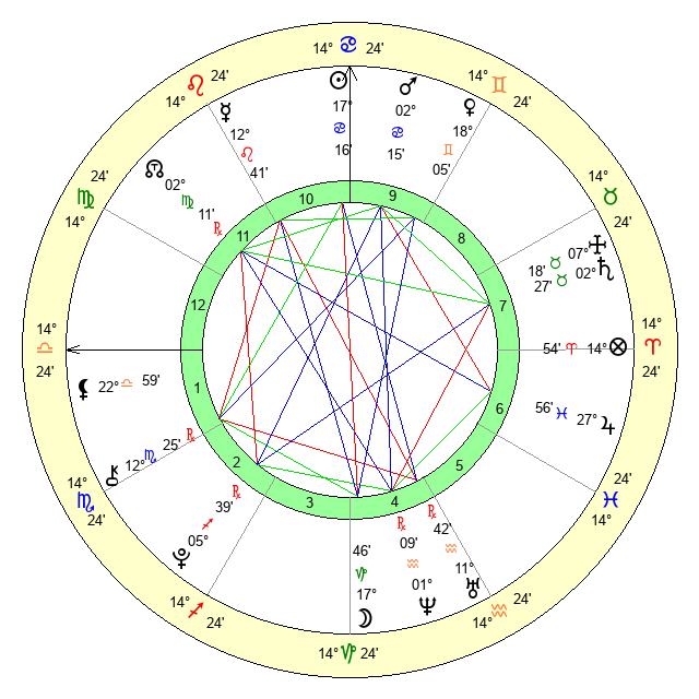 | Mars | 2 Cancer 15 | 12 Virgo 52 | 20 Cancer 12 |