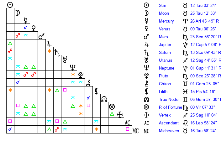 | Moon | 25 Taurus 20 | 13 Cancer 57 | 4 Sagittarius 48 |