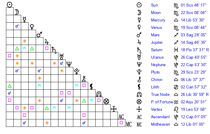 | Moon | 22 Scorpio 0 | 18 Sagittarius 11 | 0 Capricorn 32 |