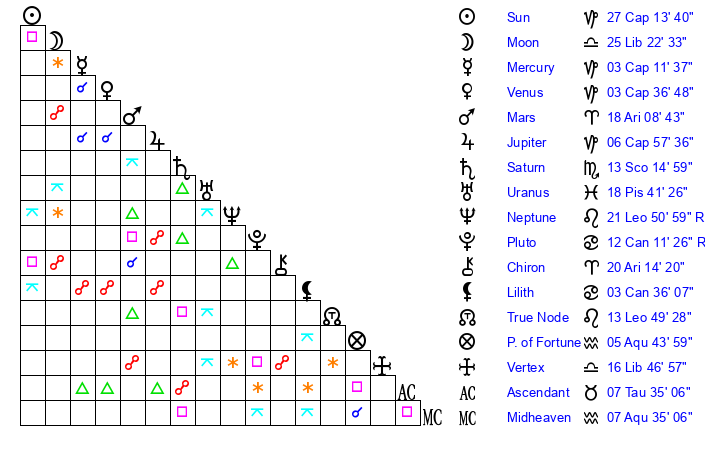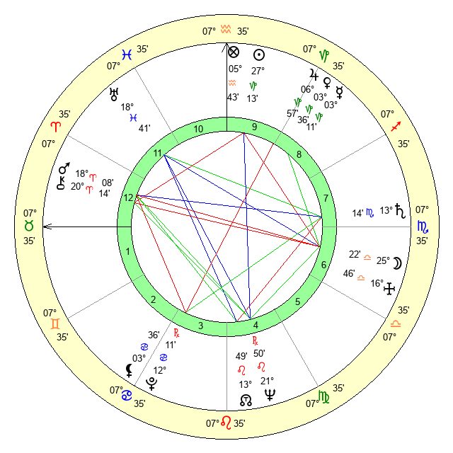 | Saturn | 13 Scorpio 46 | 15 Pisces 54 | 11 Scorpio 55 |