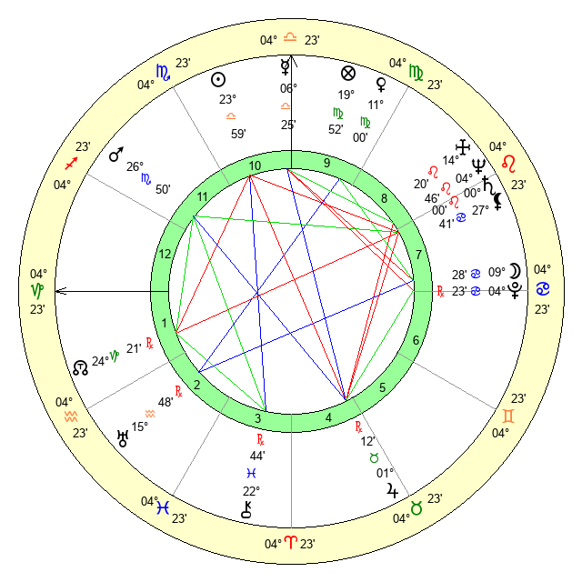 | Moon | 9 Cancer 34 | 11 Virgo 53 | 7 Cancer 9 |