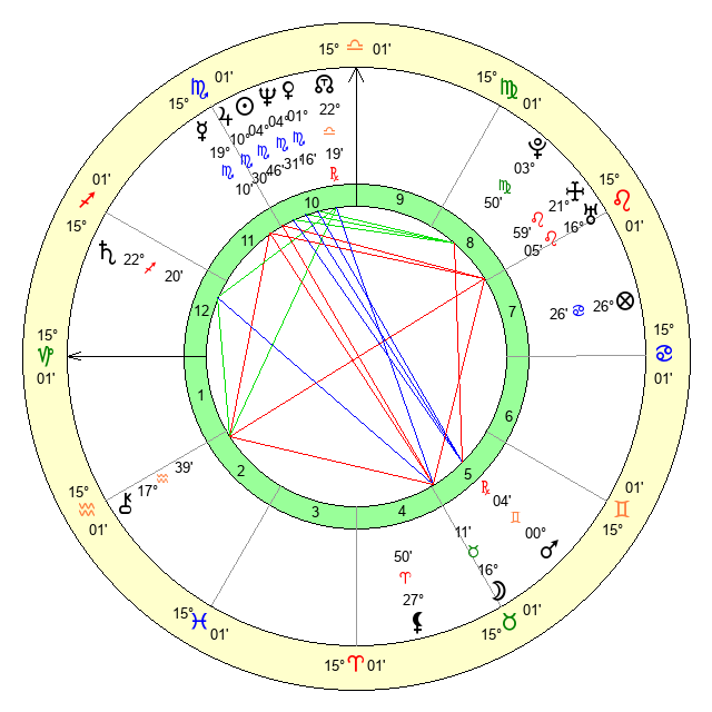 | Moon | 16 Taurus 14 | 24 Capricorn 21 | 29 Libra 3 |